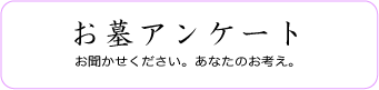 ◆お墓、または納骨堂はお持ちですか。 自分(または配偶者)が購入したものがある 親が購入したものがある 利用できるお墓、納骨堂があるかどうかわからない 代々のお墓があるが、自分で持ちたい *お墓、納骨について知りたい方はこちらでどうぞ。→ ◆新たにお墓・納骨堂を用意するなら、誰のためですか(複数チェック可) 自分のため 夫婦のため 夫婦と子どものため 自分の親のため 義理(配偶者)の親のため 先祖の遺骨を一個所にまとめるため ◆お墓、納骨堂はどのような土地柄がいいですか(複数可) 今住んでいる地域 生まれ故郷 自分の宗派の敷地内 山手の静かなところ 交通の便のいいところ 土地柄はこだわらない その他 ◆お墓・納骨堂を選ぶとしたらどのようなイメージですか(複数可) 静か 厳か(おごそか) 格調がある 明るい きれい、清潔 気持ちがゆったりする 親しみやすい 豪華な感じ シンプル 宗教色がない その他 ◆お参りする時に、欲しい設備がありますか(複数可) 故人と静かに対話できるゆったりしたスペース 清潔なトイレ 他人を気にせずお参りできる造り エアコンがあって、寒さ暑さをしのげる 広い駐車場 蚊などの虫が入り込まない設備 その他 ◆購入の大事なポイントは何ですか(複数可) 希望の地域にある 信頼できる運営事業者(お寺) 広告などで、知っている運営上業者(お寺、葬祭場など) 遺骨の管理(お守り)がしっかり行われる 掃除など日常の手入れが行き届いている 30年、50年以上も保てる、丈夫な造り 火災、地震などの災害に耐える構造 他と比べて、安い価格 バリアフリーの設計になっている イメージが自分とあっている その他 ありがとうございました。 最後にお住まいの都道府県、区市群名をお知らせください。 都道府県: 区市郡: お墓や納骨についての情報メルマガを希望されますか 希望する 電子メールアドレス 希望しない 以上の内容でよろしければ送信ボタンをクリックしてください。